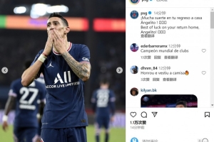 巴黎官方社媒晒出迪马利亚的照片,并写道:“祝你回家一切顺利,天使!”